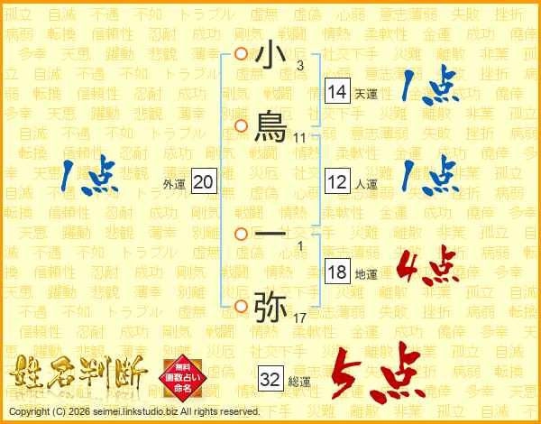小(3画)鳥(11画) 一(1画)弥(17画)
