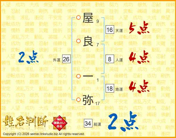 屋(9画)良(7画) 一(1画)弥(17画)