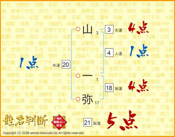 山一弥さんの総運は21画の5点!