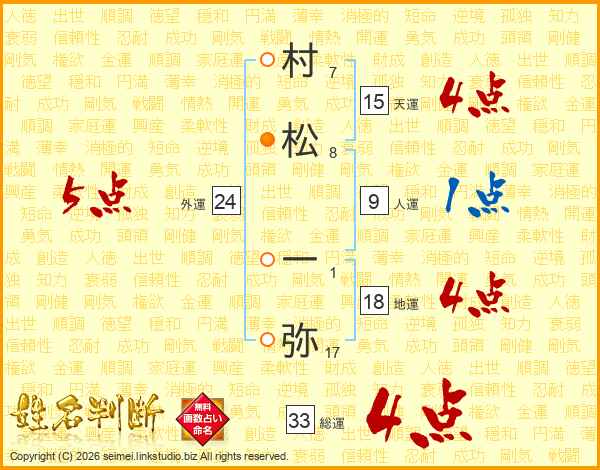 村(7画)松(8画) 一(1画)弥(17画)