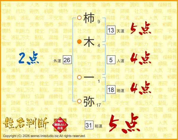 生活面を象徴する運勢です。外部から受ける影響力を表し、結婚運、家庭運や職場、環境への順応性を表します。総運から人運を引いた画数。姓や名が1文字の場合を除く。