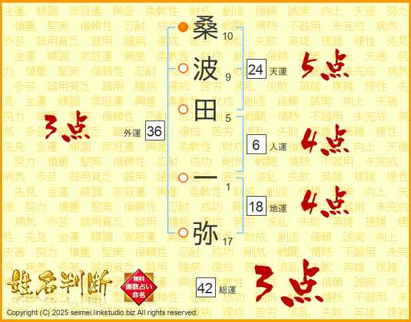 桑(10画)波(9画)田(5画) 一(1画)弥(17画)