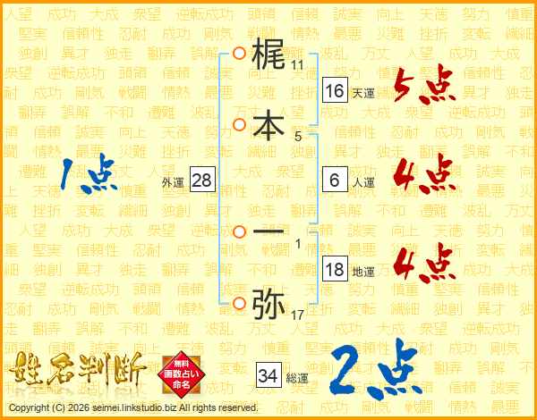 生活面を象徴する運勢です。外部から受ける影響力を表し、結婚運、家庭運や職場、環境への順応性を表します。総運から人運を引いた画数。姓や名が1文字の場合を除く。