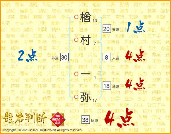 楢村一弥さんの総運は38画の4点!