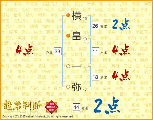 生活面を象徴する運勢です。外部から受ける影響力を表し、結婚運、家庭運や職場、環境への順応性を表します。総運から人運を引いた画数。姓や名が1文字の場合を除く。