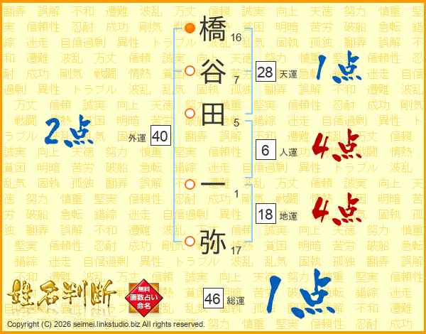 橋谷田一弥さんの総運は46画の1点!