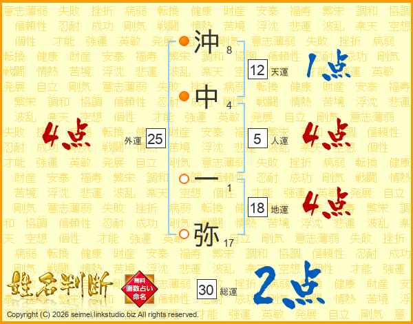 沖(8画)中(4画) 一(1画)弥(17画)