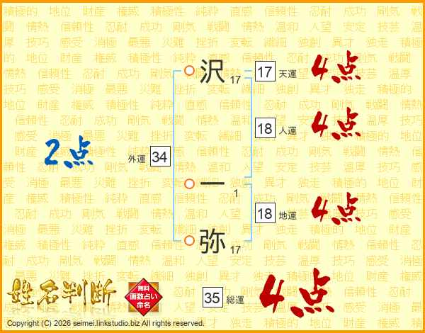 生活面を象徴する運勢です。外部から受ける影響力を表し、結婚運、家庭運や職場、環境への順応性を表します。総運から人運を引いた画数。姓や名が1文字の場合を除く。