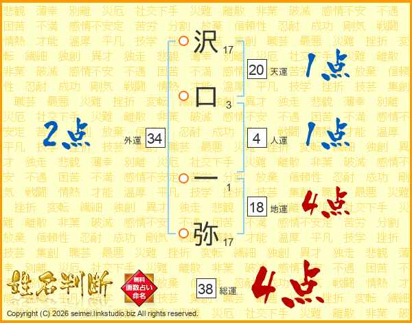 沢(17画)口(3画) 一(1画)弥(17画)