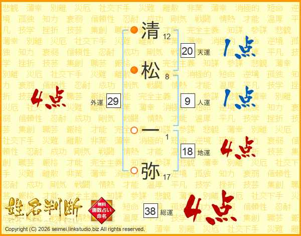 生活面を象徴する運勢です。外部から受ける影響力を表し、結婚運、家庭運や職場、環境への順応性を表します。総運から人運を引いた画数。姓や名が1文字の場合を除く。