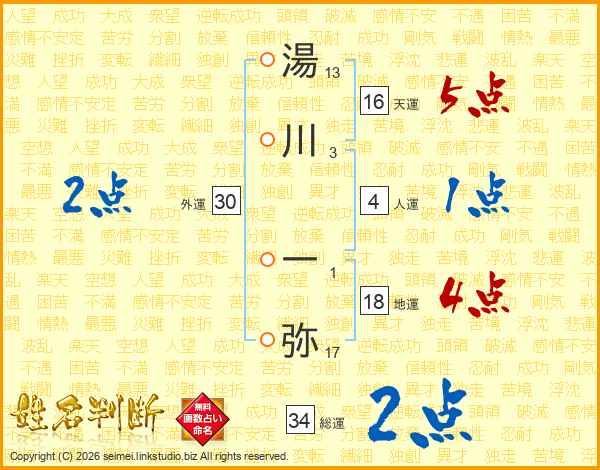 湯川一弥さんの総運は34画の2点!