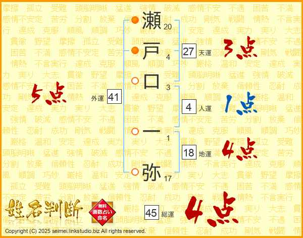 瀬戸口一弥さんの総運は45画の4点!