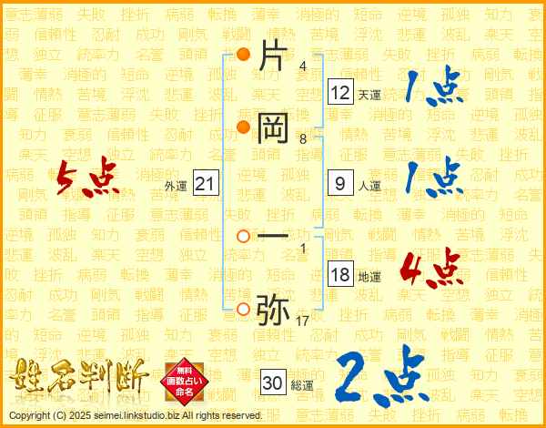 生活面を象徴する運勢です。外部から受ける影響力を表し、結婚運、家庭運や職場、環境への順応性を表します。総運から人運を引いた画数。姓や名が1文字の場合を除く。