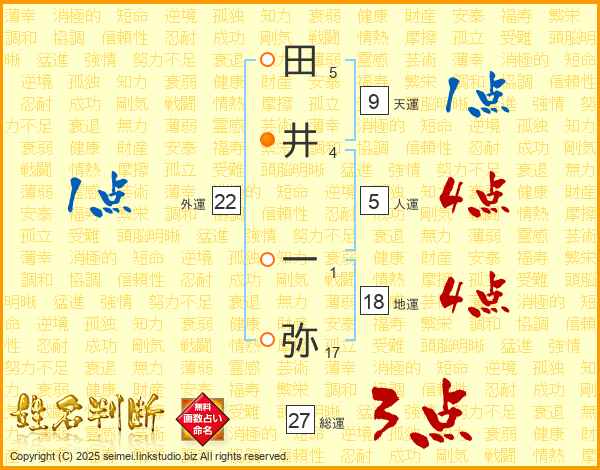 田(5画)井(4画) 一(1画)弥(17画)
