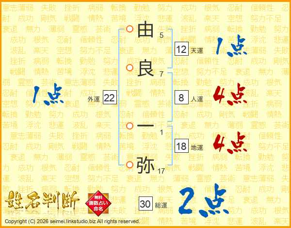 生活面を象徴する運勢です。外部から受ける影響力を表し、結婚運、家庭運や職場、環境への順応性を表します。総運から人運を引いた画数。姓や名が1文字の場合を除く。
