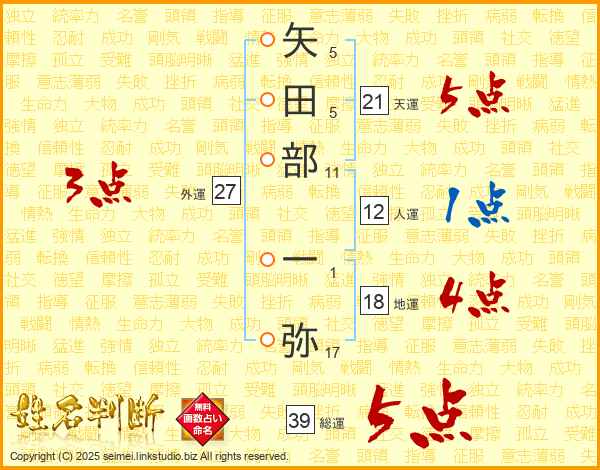 矢(5画)田(5画)部(11画) 一(1画)弥(17画)