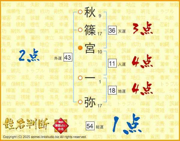 秋(9画)篠(17画)宮(10画) 一(1画)弥(17画)