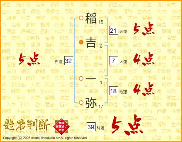 稲吉一弥さんの総運は39画の5点!