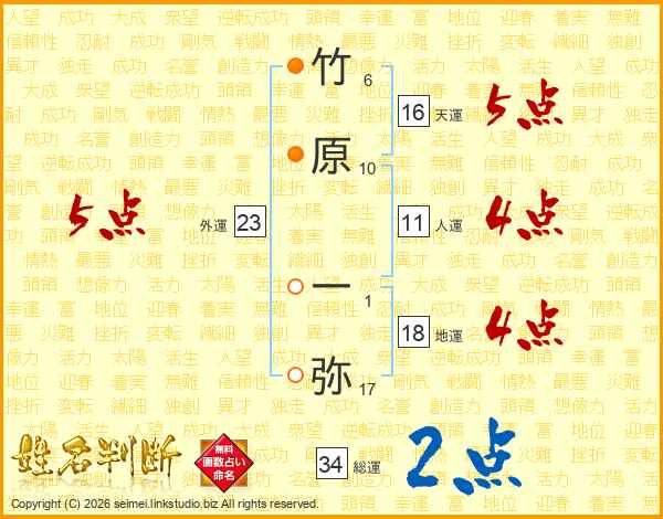 あなたの人生を表す1番重要な運勢です。生涯を通じて影響する総合運となり、主に50歳以降の晩年期に影響を及ぼします。苗字と名前の合計画数。