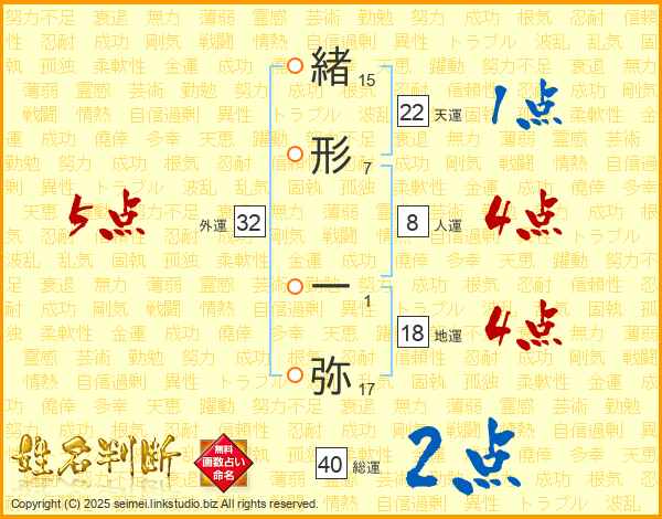生活面を象徴する運勢です。外部から受ける影響力を表し、結婚運、家庭運や職場、環境への順応性を表します。総運から人運を引いた画数。姓や名が1文字の場合を除く。