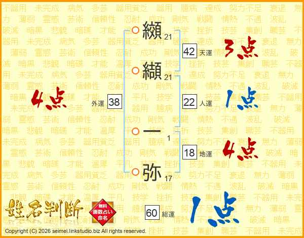 画数の奇数(○陽)と偶数(●陰)の配列で吉凶を占います。どちらかにかたよる名前は大凶名で避ける必要があります。画数の奇数偶数。