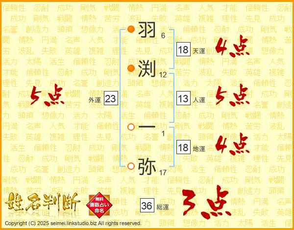 あなたの人生を表す1番重要な運勢です。生涯を通じて影響する総合運となり、主に50歳以降の晩年期に影響を及ぼします。苗字と名前の合計画数。