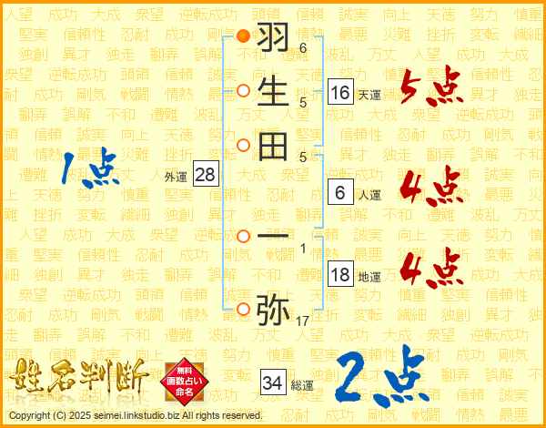 羽(6画)生(5画)田(5画) 一(1画)弥(17画)