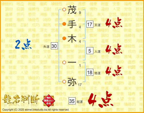 茂(9画)手(4画)木(4画) 一(1画)弥(17画)