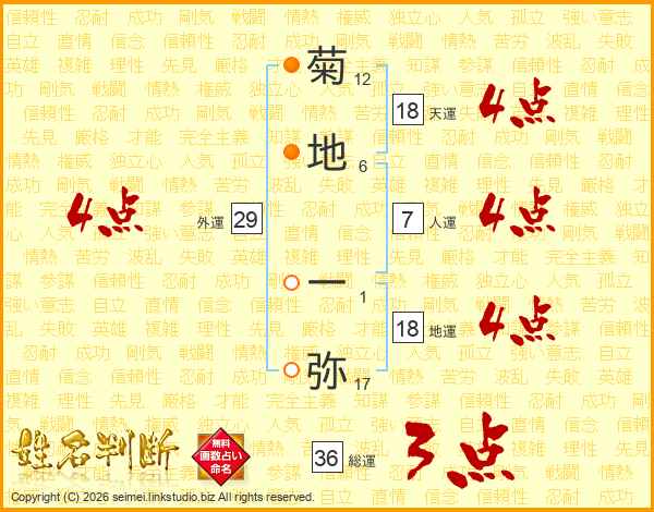 家系が持つ宿命的な運勢を表します。祖先から受け継いだ苗字ですので自分の力が及びません。家柄を象徴します。苗字の合計画数。