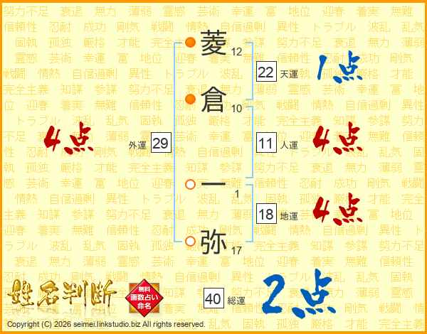 菱(12画)倉(10画) 一(1画)弥(17画)
