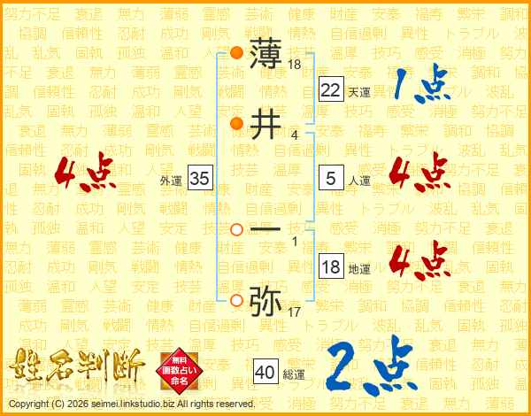 生活面を象徴する運勢です。外部から受ける影響力を表し、結婚運、家庭運や職場、環境への順応性を表します。総運から人運を引いた画数。姓や名が1文字の場合を除く。