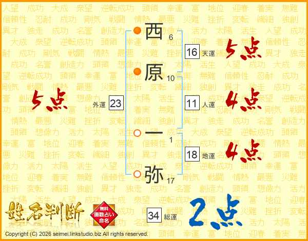 生活面を象徴する運勢です。外部から受ける影響力を表し、結婚運、家庭運や職場、環境への順応性を表します。総運から人運を引いた画数。姓や名が1文字の場合を除く。