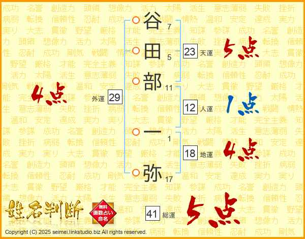 谷田部一弥さんの総運は41画の5点!