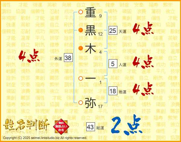 重(9画)黒(12画)木(4画) 一(1画)弥(17画)