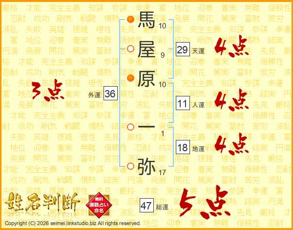 馬(10画)屋(9画)原(10画) 一(1画)弥(17画)