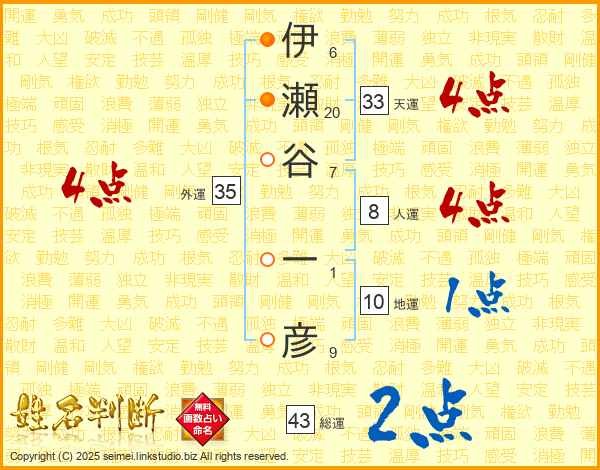 伊瀬谷一彦さんの総運は43画の2点!