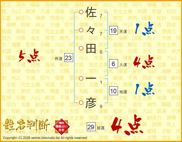佐々田一彦さんの総運は29画の4点!