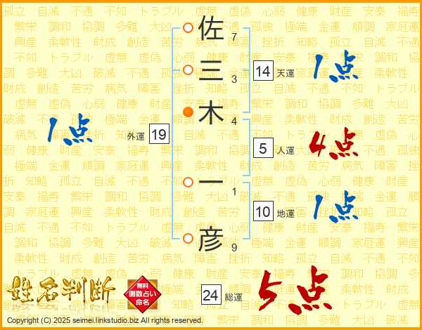 佐三木一彦さんの総運は24画の5点!