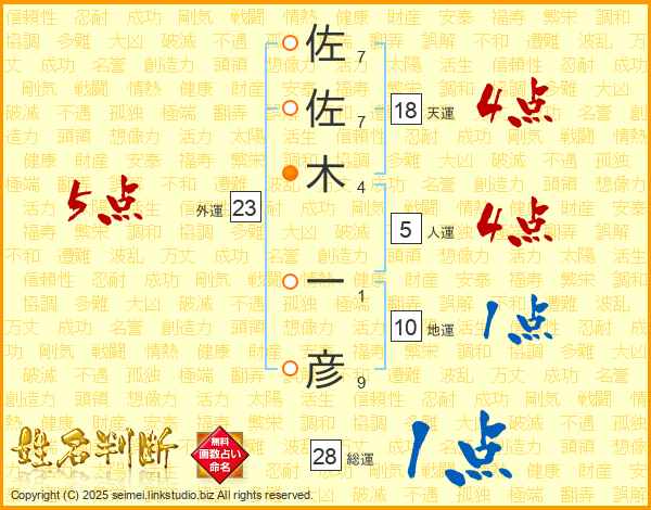 佐(7画)佐(7画)木(4画) 一(1画)彦(9画)