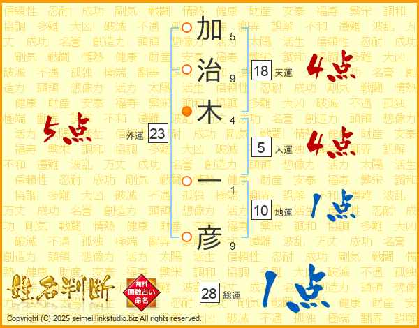加(5画)治(9画)木(4画) 一(1画)彦(9画)