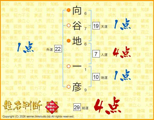 向(6画)谷(7画)地(6画) 一(1画)彦(9画)