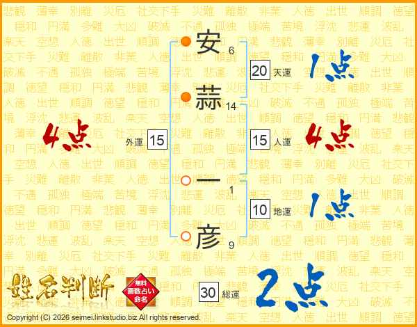 安(6画)蒜(14画) 一(1画)彦(9画)