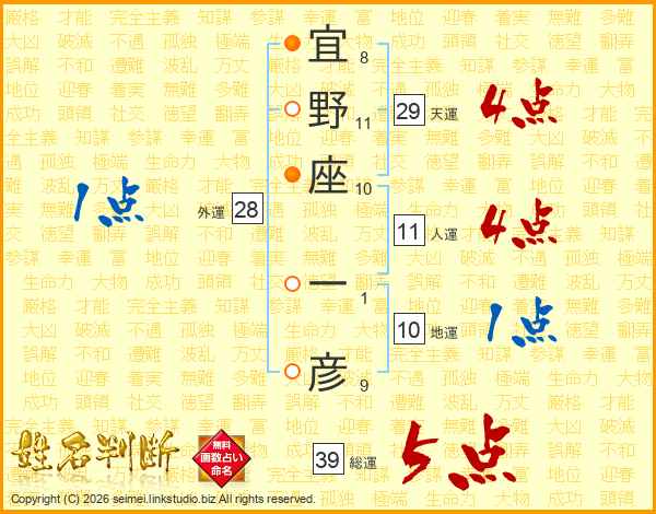 宜(8画)野(11画)座(10画) 一(1画)彦(9画)