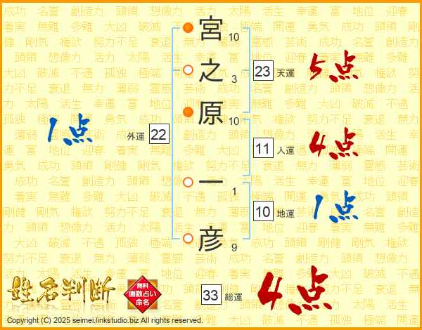 宮(10画)之(3画)原(10画) 一(1画)彦(9画)