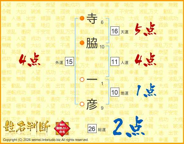 寺(6画)脇(10画) 一(1画)彦(9画)