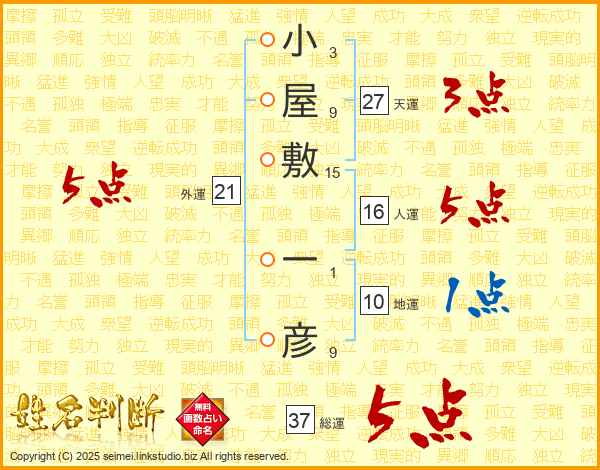 小(3画)屋(9画)敷(15画) 一(1画)彦(9画)