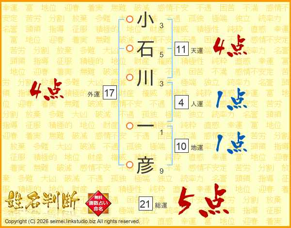 小石川一彦さんの総運は21画の5点!