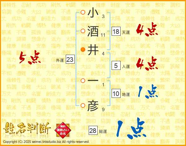 小(3画)酒(11画)井(4画) 一(1画)彦(9画)