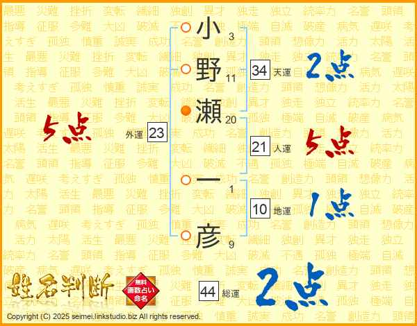 小(3画)野(11画)瀬(20画) 一(1画)彦(9画)