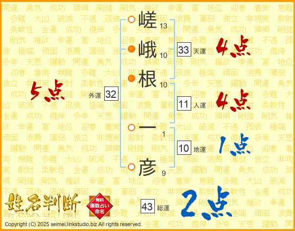 嵯(13画)峨(10画)根(10画) 一(1画)彦(9画)